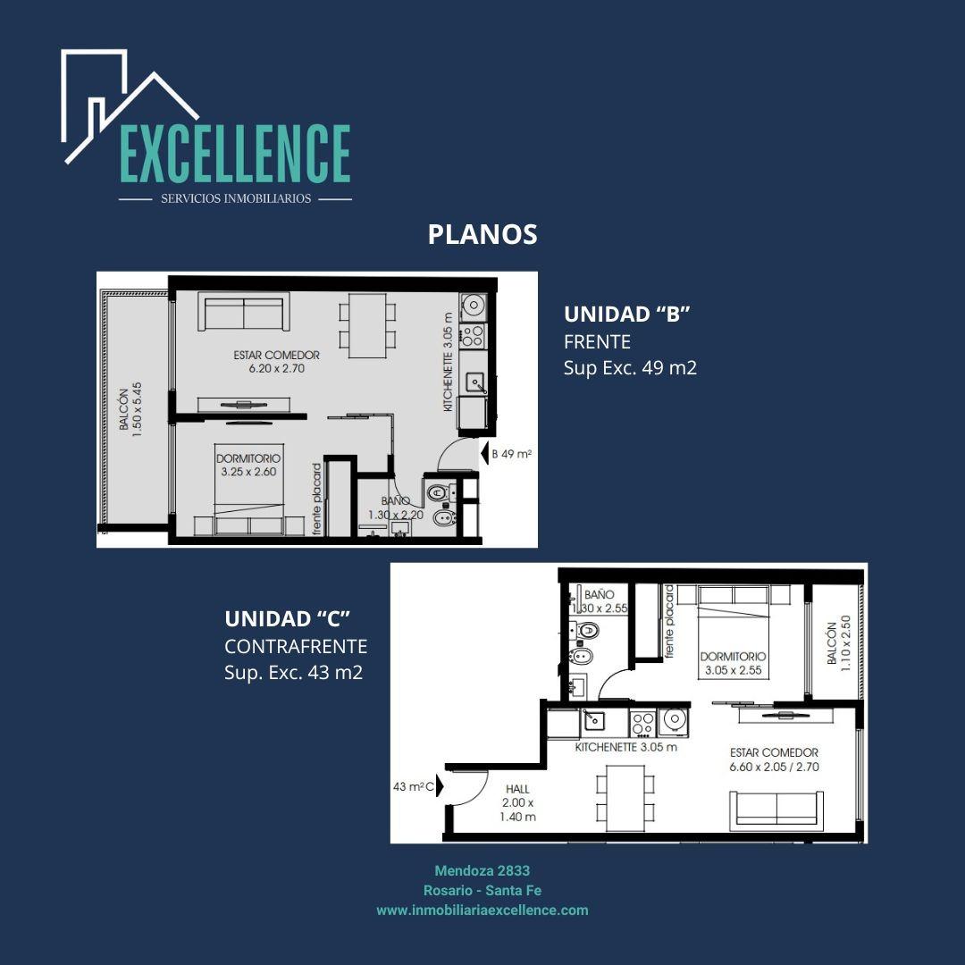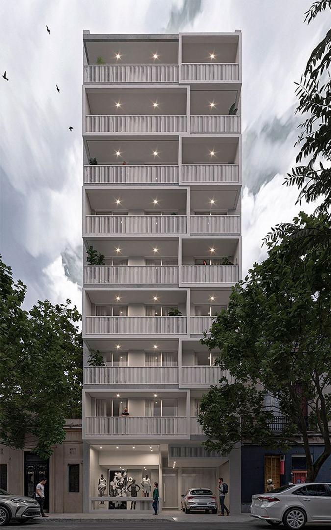 Descripción de las unidades. Departamentos de 1 dormitorio al frente, todos con balcón. Superficies exclusivas de 49 m2.